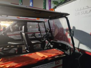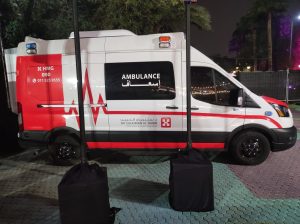 عربة اسعاف وحدة عناية مجهزة نقالات وفرق طبية على اهبة الاستعداد يتواصلون باحتراف عبر اجهزة الاتصال ويتدخلون في اللحظة المناسبة ويمنحون الطمأنينة قبل العلاج .
