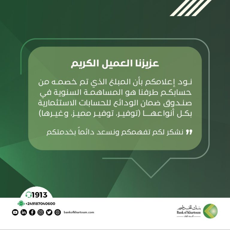 أعلن بنك الخرطوم عن خصم المبلغ السنوي لمساهمة صندوق ضمان الودائع من الحسابات الاستثمارية للعملاء، والتي تشمل حسابات التوفير والتوفير المميز وغيرها. وأكد البنك أن هذا الخصم يتم وفقاً للأنظمة واللوائح المعمول بها، وشكر عملائه على تفهمهم وتعاونهم.