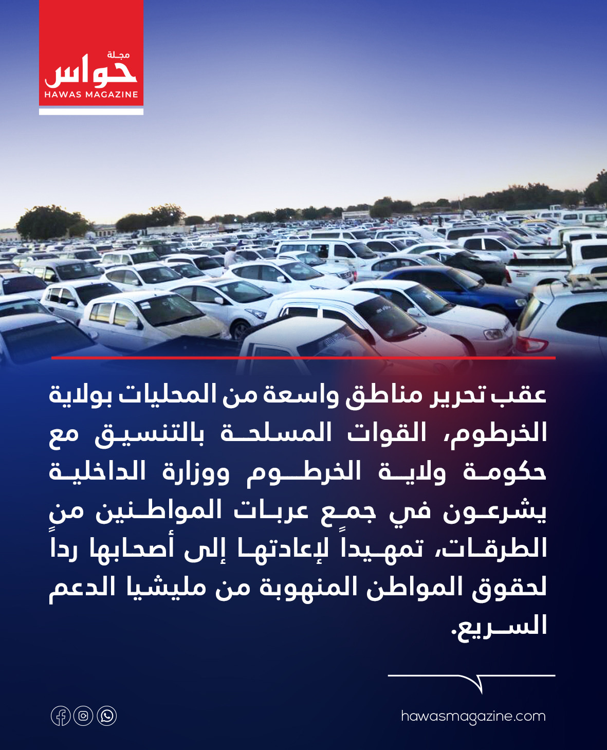 عقب تحرير مناطق واسعة من المحليات بولاية الخرطوم ، القوات المسلحة بالتنسيق مع حكومة ولاية الخرطوم ووزارة الداخلية يشرعون في جمع عربات المواطنين من الطرقات ، تمهيدا لإعادتها إلى أصحابها ردا لحقوق المواطن المنهوبة بواسطة مليشيا الدعم السريع .