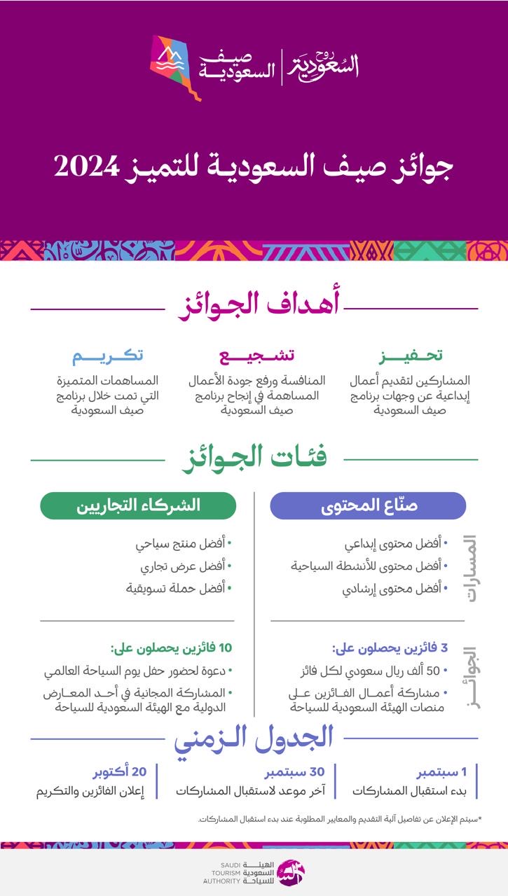 أعلنت الهيئة السعودية للسياحة عن تفاصيل “جوائز صيف السعودية للتميز 2024″، والتي أطلقها وزير السياحة، رئيس مجلس إدارة الهيئة السعودية للسياحة أحمد بن عقيل الخطيب في ورشة عمل جمعت منظومة السياحة السعودية مع الشركاء من القطاع الخاص في شهر مايو الماضي. ويأتي ذلك في إطار جهود الهيئة لتعزيز المحتوى الإعلامي والتسويقي، وتحفيز صناع المحتوى والشركاء من القطاع الخاص، بهدف إبراز دورهم في إنجاح وإثراء برنامج صيف السعودية 2024.